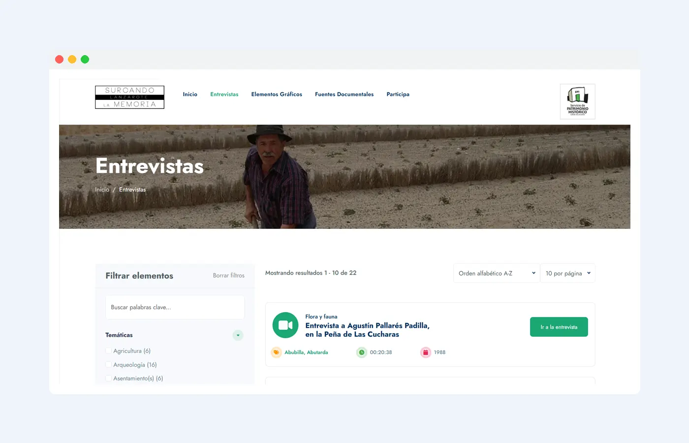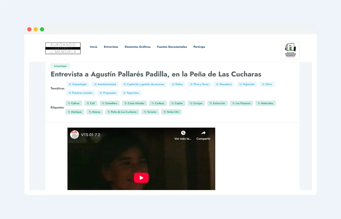Repositorio digital orientado a investigadores para publicar y consultar material documental y audiovisual sobre la historia de El Jable (Lanzarote). Integra contenido audiovisual mediante enlaces a YouTube y gestiona documentos subidos directamente, con un administrador de contenidos para mantener el archivo vivo y organizado.