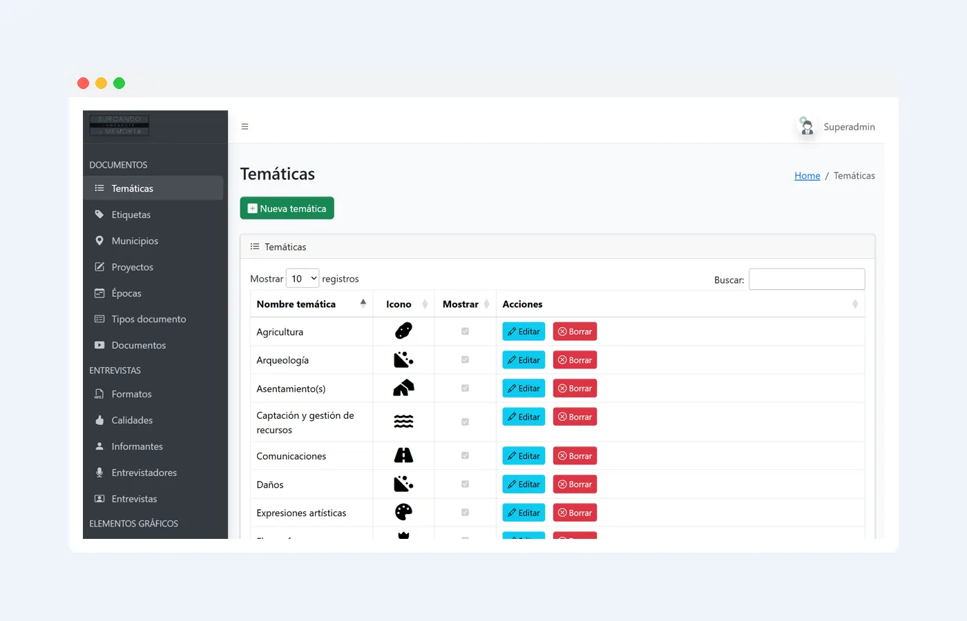 Se desarrolló una plataforma web especializada con un panel de administración propio para gestionar documentos, audios, vÃdeos y colecciones temáticas. La solución integra contenido audiovisual a través de YouTube y almacena directamente documentos y fotografÃas en el servidor. El sitio está estructurado para facilitar búsquedas, filtrados y navegación temática, asegurando la preservación y difusión del archivo histórico de forma accesible y organizada.